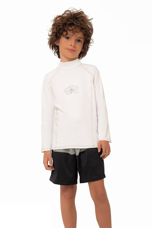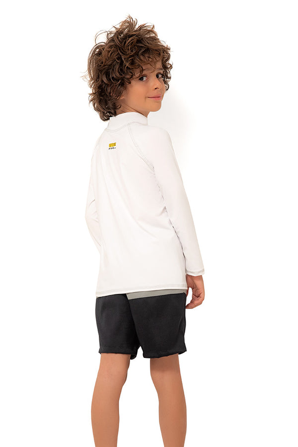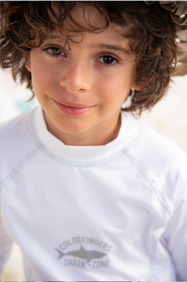 Camiseta de baño color blanco para niño, manga larga con cuello de ajuste perfecto. Fabricado en Poliéster/Lycra. Cloro resistente, resistente al agua de mar, No debe someterse a raspaduras.Conoce las características únicas que destacan nuestros vestidos de baño: PROTECCIÓN SOLAR UPF50+:...