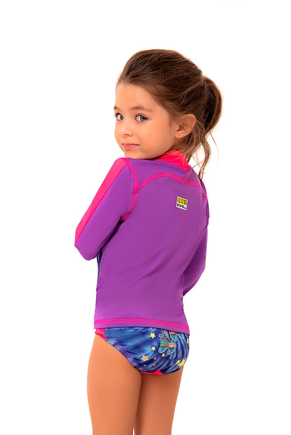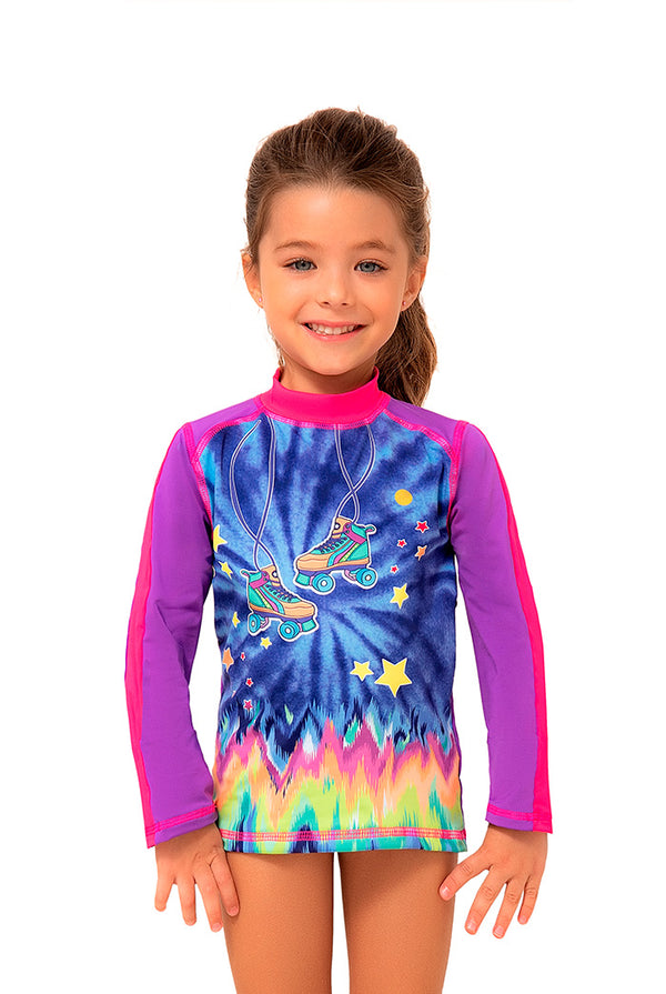 Vestido de baño dos piezas multicolor, incluye una camiseta (rash guard) de manga larga con cuello de ajuste perfecto y estampado en la parte delantera, junto con un panty compañero estampado en la parte trasera. Fabricado en Poliéster/Lycra. Ofrece protección...