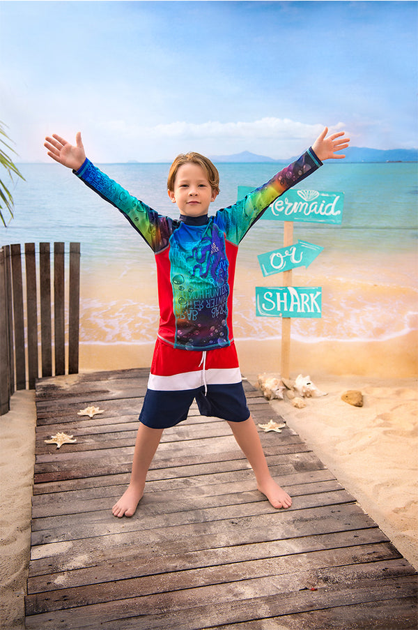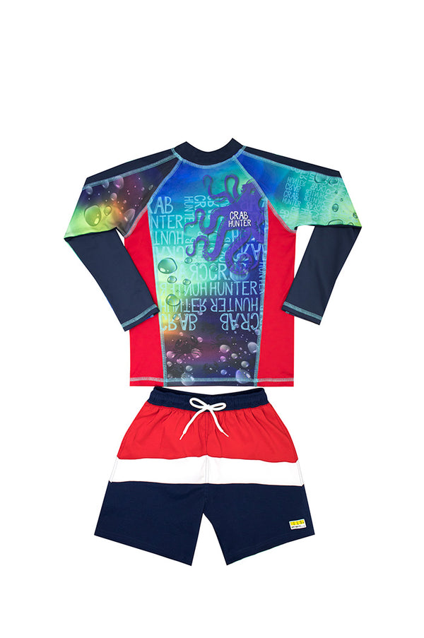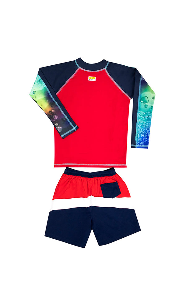 Vestido de baño dos piezas multicolor, para niño, incluye una camiseta (rash guard) de manga larga con cuello de ajuste perfecto, estampada en el frente y las mangas. Fabricada en Poliéster/Lycra. Resistente al cloro, resistente al agua de mar. También...