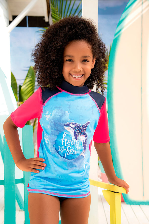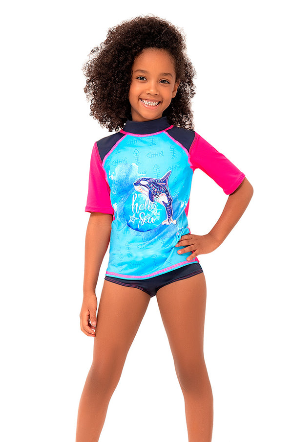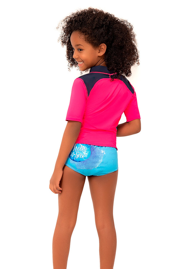 Vestido de baño dos piezas para niña incluye una Camiseta (rash guard) de manga corta con cuello de ajuste perfecto, estampado al frente, y una panty compañera estampada en la parte trasera. Fabricado en Poliéster/Lycra. Resistente al cloro, resistente al...