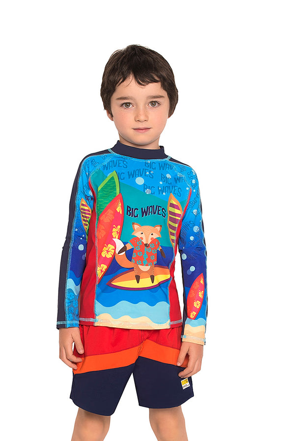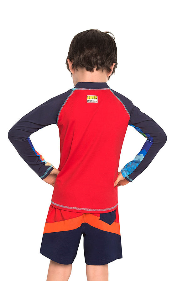 Vestido de baño dos piezas para niño multicolor, incluye una camiseta (rash guard) de manga larga con cuello de ajuste perfecto, estampada en el frente y en las mangas. Fabricada en Poliéster/Lycra, es resistente al cloro, al agua de mar...