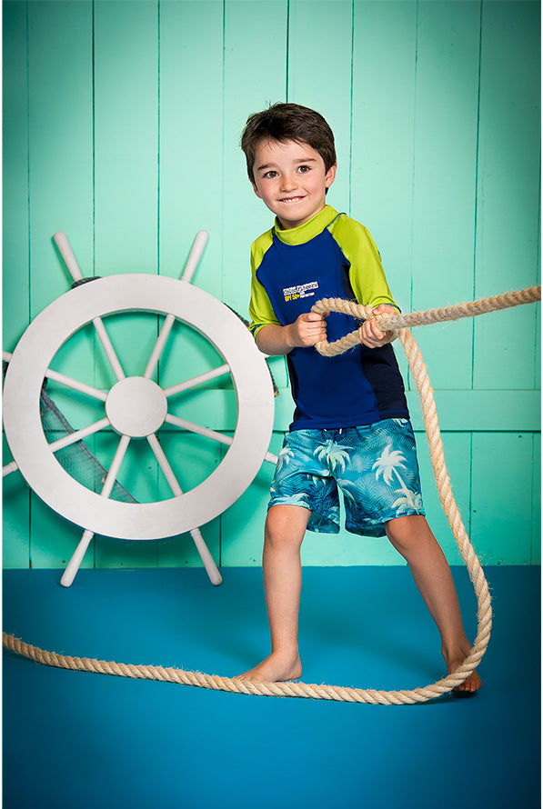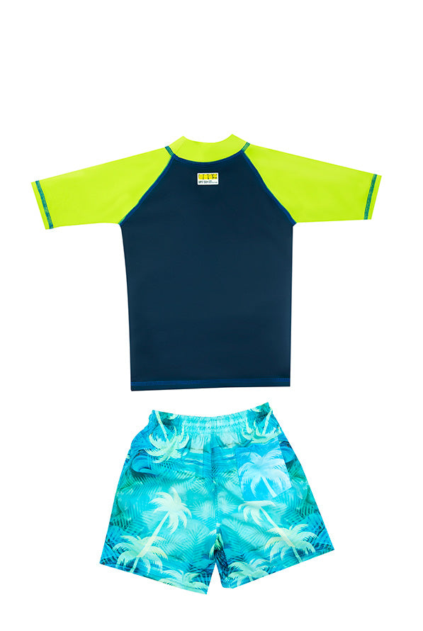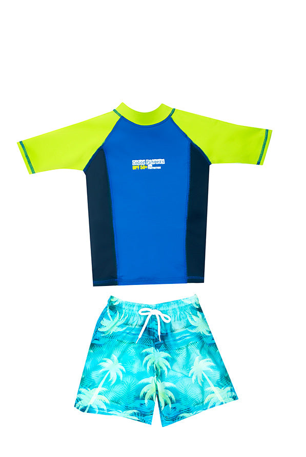 Vestido de baño dos piezas para niño multicolor, incluye Camiseta (rash guard) de manga corta con cuello de ajuste perfecto, en colores planos. Fabricado en Poliéster/Lycra. Ofrece protección UPF 50+, es resistente al cloro y al agua de mar. No...