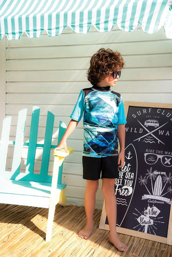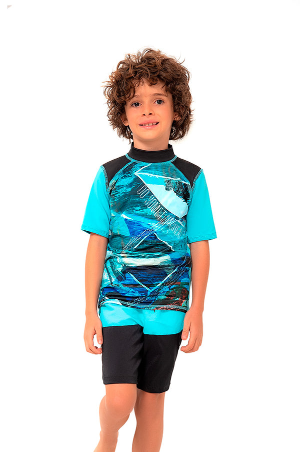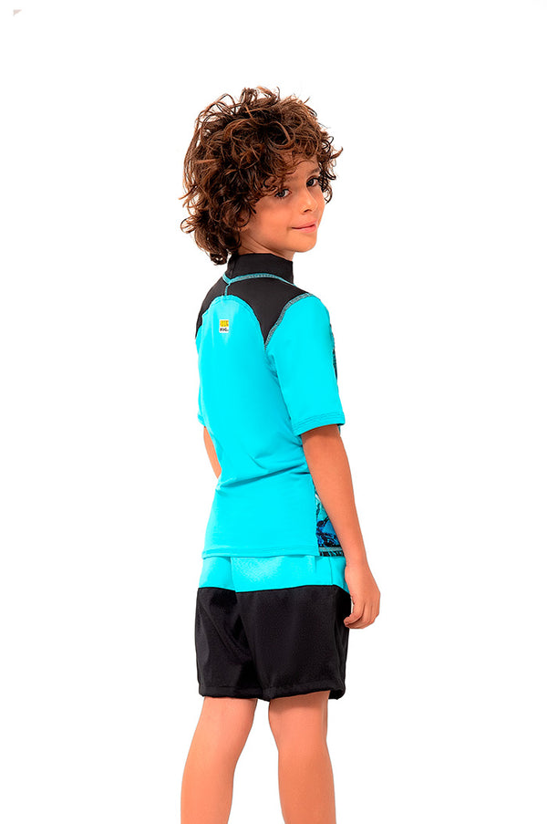 Vestido de baño dos piezas multicolor, para niño. Incluye camiseta (rash guard) de manga corta con cuello de ajuste perfecto, estampada al frente. Fabricada en Poliéster/Lycra. Resistente al cloro, resistente al agua de mar. Y pantaloneta playera con cordón, fabricada...