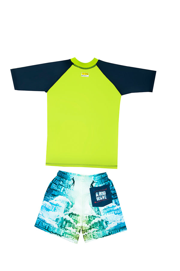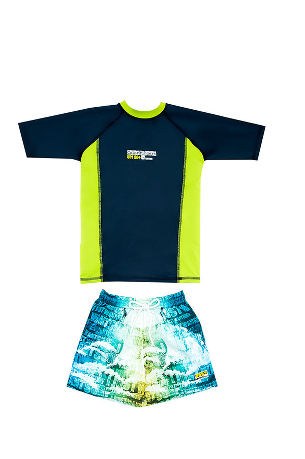Vestido de baño dos piezas, para niño, incluye una Camiseta (rash guard) de manga corta con cuello de ajuste perfecto, colores planos. Fabricada en Poliéster/Lycra. Protección UPF 50+, resistente al cloro, resistente al agua de mar. Y una pantaloneta playera...