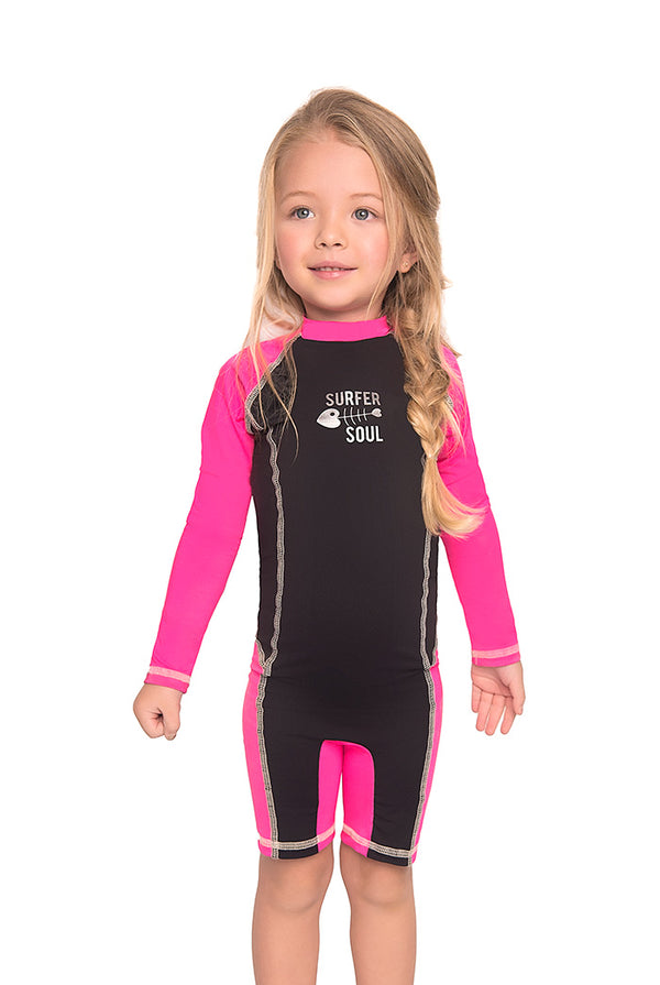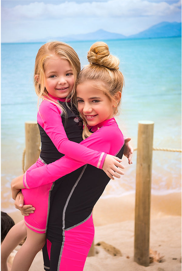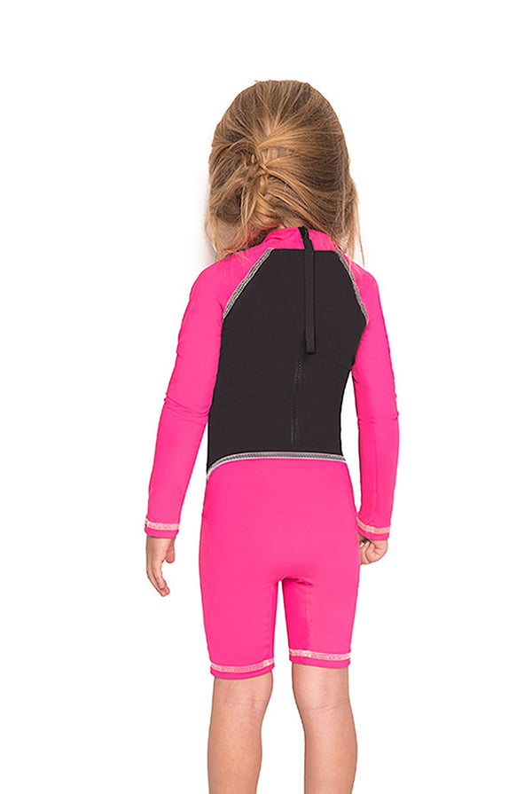 Vestido de baño enterizo de manga larga para niña con cuello de ajuste perfecto, cierre en la espalda, color Negro y Fucsia.Fabricado en Poliéster/Lycra. Resistente al cloro, resistente al agua de mar. No debe someterse a raspaduras.Conoce las características únicas...
