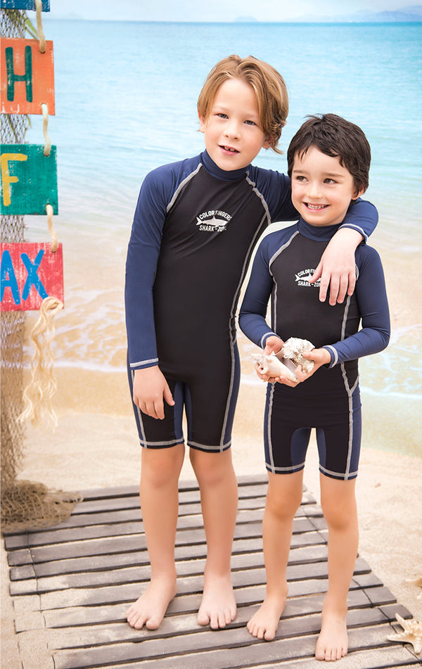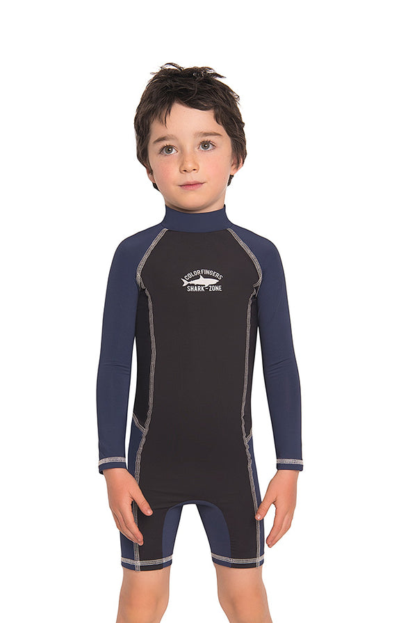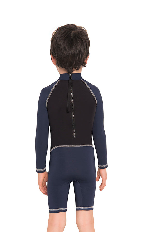 Vestido de baño enterizo manga larga para niño con cuello de ajuste perfecto, con cierre en la espalda, color Negro y Azul.Fabricado en Poliéster/Lycra. cloro resistente, resistente al agua de mar. No debe someterse a raspaduras.Conoce las características únicas que...